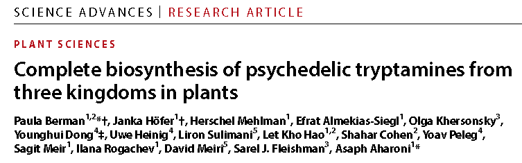Il primo aprile 2026 (e non è uno scherzo), la rivista Science Advances ha pubblicato uno studio destinato a lasciare un segno duraturo nella storia della biochimica e della farmacologia degli psichedelici. Il gruppo di ricerca guidato da Paula Berman e Asaph Aharoni del Weizmann Institute of Science (Israele) ha riportato la prima elucidazione completa della via biosintetica della N,N-dimetiltriptamina (DMT) nelle piante, e ha dimostrato la fattibilità di ricostituire in un unico sistema vegetale le vie biosintetiche di cinque triptamine psicoattive provenienti da tre regni della vita: piante, funghi e animali.